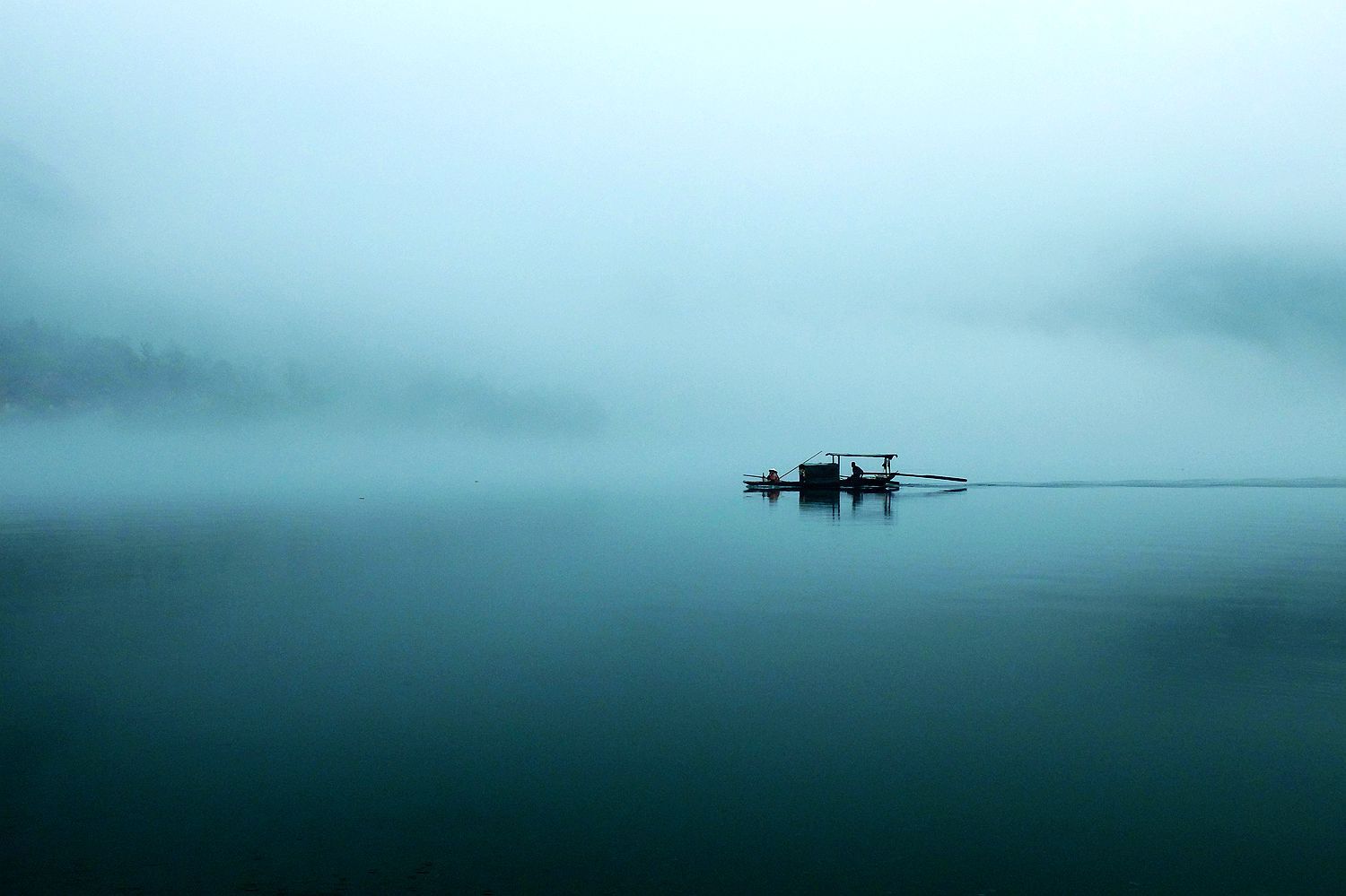 静静地湖,一叶小舟飘过,构成一幅仙人般的梦幻画卷。